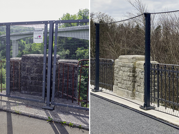 Vorher/nachher: Der neue, feinmaschige Suizidschutz ist farblich abgestimmt und so installiert, dass das historische Geländer gut erkennbar bleibt – eine Lösung, die Sicherheit und Gestaltung harmonisch vereint.