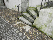 Formwilde Natursteine und Bandsteine bringen den Wegcharakter hervor und trennen die Hauseingänge optisch von dem Platz ab. Der einheitliche Farbton der Steine trägt zu einem harmonischen Gesamtbild bei und die Verlegearten in Ost-West und Nord-Süd unterstreichen den Verlauf des Platzes und der Gasse. Selbst die Schachtdeckel wurden mit Pflastersteinen ausgebildet, um sie besser in die Gasse zu integrieren.