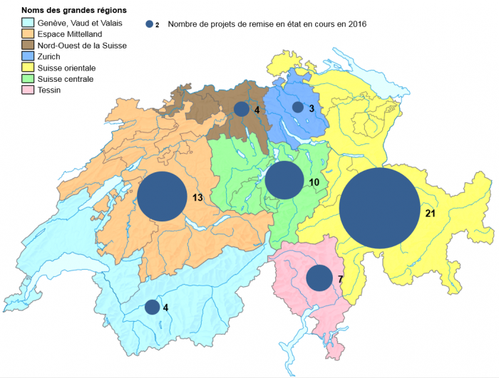 Ill. : Nombre de projets de remise en état en cours en 2016 par grandes régions (source : support cartographique ThemaKart OFS 2004 / infographie IVS) |