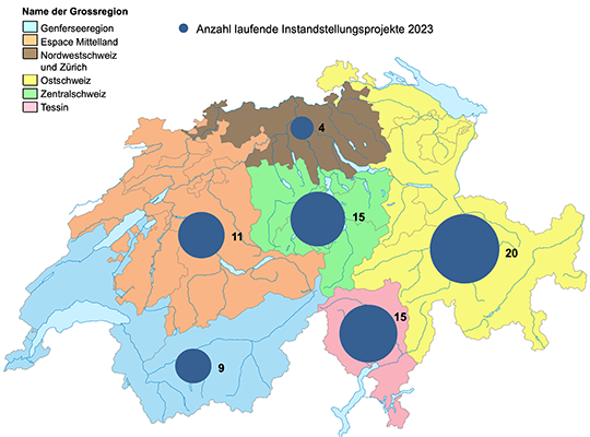 Zunahme der IVS-Projekte im Jahr 2023 | Die Zahl der verfügten Finanzhilfeprojekte, die das ASTRA aktuell bearbeitet, ist von 65 im Jahr 2022 auf 74 im Jahr 2023 gestiegen. Davon haben 26 in diesem Jahr eine Zusage für eine Finanzhilfe erhalten (2022 waren es 18 neue Projekte gewesen), während 17 Projekte (2022: 25) abgeschlossen werden konnten. Derzeit befinden sich 5 Projekte in der Verfügungsphase, in der über die definitive Finanzhilfeunterstützung entschieden wird. Die Verteilung der Projekte auf die Regionen zeigt, dass die Zahl der Instandsetzungen gleichmässig zugenommen hat. Eine Ausnahme bildet einzig die Nordwestschweiz. Erfreulich ist auch, dass dieses Jahr viele kleinere Projekte unterstützt werden konnten, die einen wesentlichen Teil der schützenswerten historischen Verkehrswege in der Schweiz ausmachen.