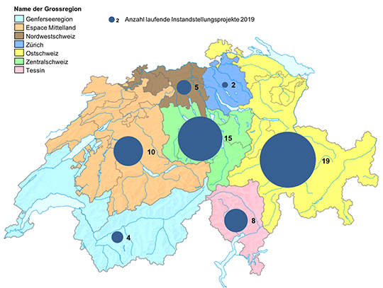 IVS-Projekte im 2019 – ein ÜberblickIm Jahr 2019 hat das ASTRA für über 20 Projekte zur Erhaltung historischer Verkehrswege eine finanzielle Unterstützung verfügt. Damit werden aktuell 63 noch nicht abgeschlossene Finanzhilfeprojekte bearbeitet. Zurzeit werden zudem 16 neue Projekte geprüft. Die Anzahl der eingereichten Projekte bewegte sich 2019 im Rahmen der Vorjahre. Etwas mehr Abklärungsaufwand erforderten einige komplexere Brückenerneuerungen. Rund die Hälfte der neu verfügten Projekte befindet sich auf Wanderwegen. Die Instandstellung von Mauern in verschiedenen Erscheinungsformen und Funktionen für die historischen Verkehrswege steht nach wie vor im Zentrum. Die drei intensivsten «IVS-Regionen» bleiben die Ostschweiz, die Zentralschweiz und das Espace Mittelland. |