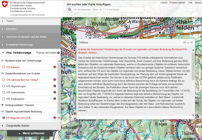 Integration der kantonalen Inventare Basel-Landschaft, Solothurn und Schaffhausen in die elektronische BundespublikationNeben dem Kanton Bern haben auch die Kantone Basel-Landschaft, Solothurn und Schaffhausen die Informationen zu ihren regionalen und lokalen IVS-Objekten gemäss Artikel 11 der Verordnung über das Bundesinventar der historischen Verkehrswege der Schweiz VIVS überarbeitet. Diese Informationen sind verbindlich und neu auch in der elektronischen Bundespublikation (IVS-GIS) ersichtlich. Die Informationen zu den rechtlichen Bestimmungen können via Infobox abgerufen werden (siehe Abbildung). Um die Benutzerfreundlichkeit zu erhöhen, wurde zudem die Menuleiste vereinfacht. So weist sie heute nur noch zwei anstelle von drei Unterebenen sowie leicht zusammengefasste Inhalte auf. |