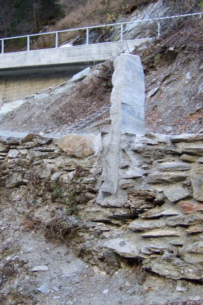 - Entlang der alten Talstrasse (Avers GR) wurden zur Wegbegrenzung abschnittsweise Kolonnensteine in den talseitigen Stützmauern verankert.