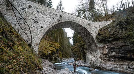 | | Construit en 1778, le pont des Planches, un pont en arc maçonné, enjambe la rivière Grande-Eau dans une gorge pittoresque de la commune vaudoise d’Ormont-Dessous. Jusqu’à la construction de la route cantonale dans les années 1830, le pont constituait un point de passage important pour le commerce régional. Il a ensuite été très utilisé par les randonneuses et randonneurs avant d’être fermé en 2015 suite à un affaissement. Grâce à l’engagement conjoint de la commune d’Ormont-Dessous, de l’association des amis du pont des Planches et de différents soutiens, il a pu être remis en état à grands frais en 2023. Le pont des Planches sera réouvert dans le cadre d’une cérémonie d’inauguration officielle le 25 mai 2024. Une précieuse voie historique sera ainsi de nouveau accessible pour (re)découvrir la pittoresque vallée des Ormonts. Lisez l’article complet sur notre site Internet.